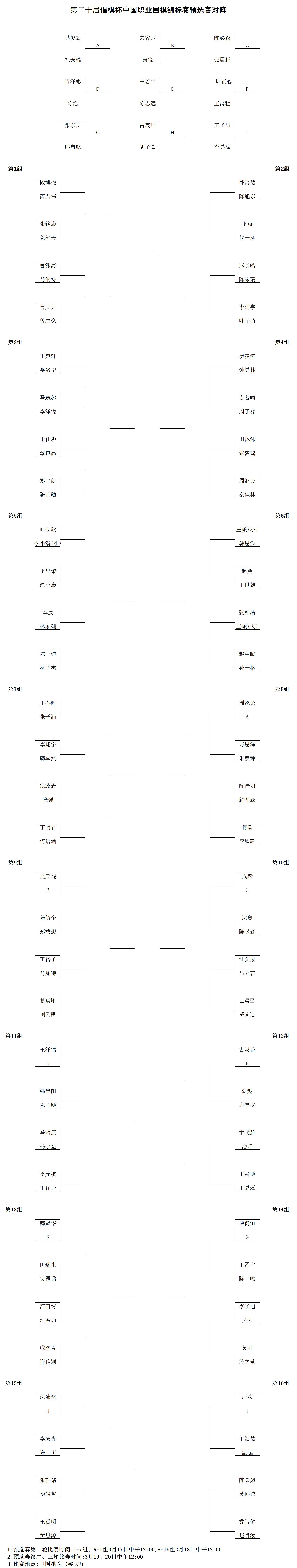 1.预选赛第一轮比赛时间:1-7组、A-I组3月17日中午12:00,8-16组3月18日中午12:00