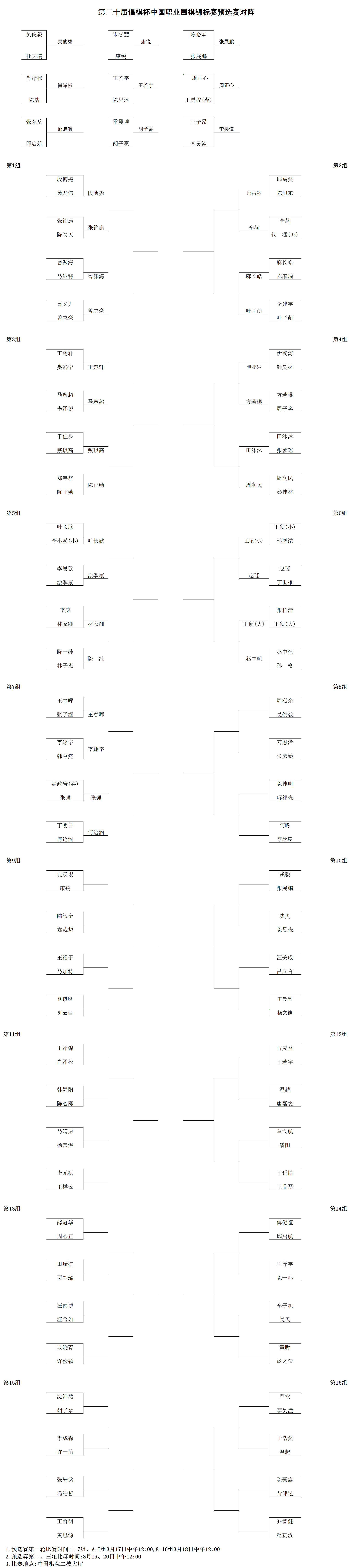 3月17日,第二十届倡棋杯中国职业围棋锦标赛预选赛开幕式在中国棋院举行,国家体育总局棋牌运动管理中心主任、党委书记、中国棋院院长贺凤翔,中国围棋协会主席常昊、名誉主席王汝南、华以刚,上海市应昌期围棋教育基金会理事长单霞丽,上海棋院院长刘世振及预选赛参赛棋手出席开幕式。